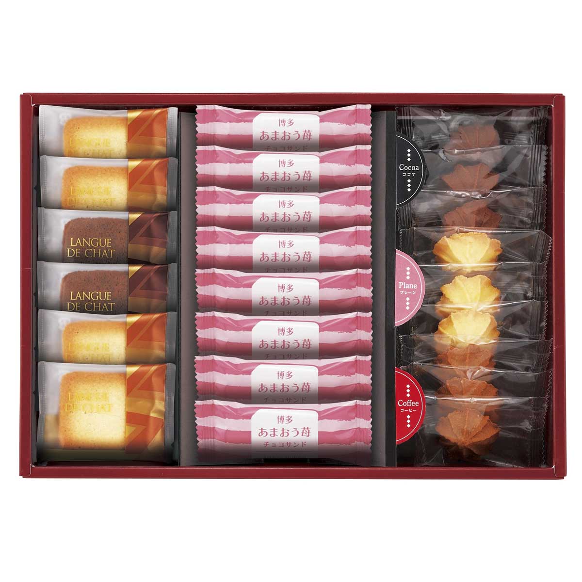 福岡名産あまおうを使用した、ほどよい甘さの「博多あまおう苺サンド」に、サクッとした食感のクッキーにホワイトクリーム・チョコレートクリームをサンドした「ラングドシャ」、プレーン・ココア・ コーヒー 3種類の味が楽しめる可愛らしい「絞りクッキー」のセット。
