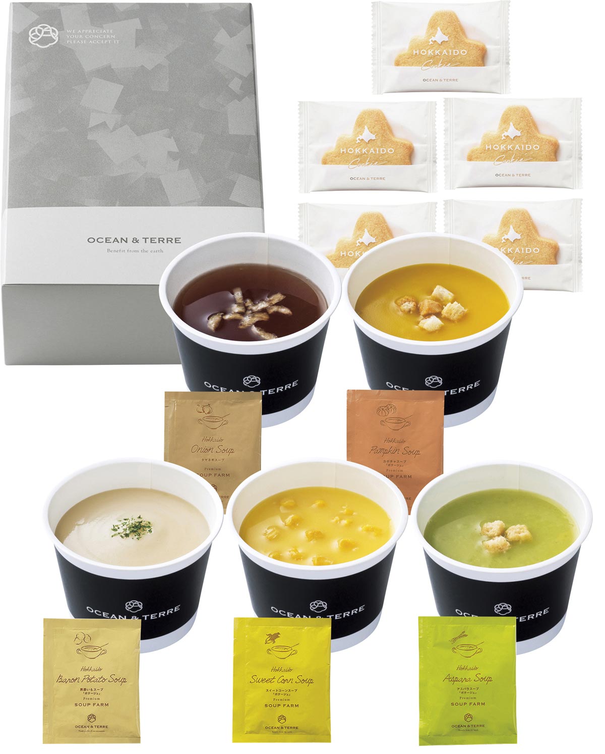 北海道の大地で育った「かぼちゃ、玉葱、男爵いも、スイートコーン、アスパラガス」の5種類のお味がお楽しみいただけます 北海道素材の美味しさをギュッと詰め込んだスープギフトです (北海道型クッキー付)