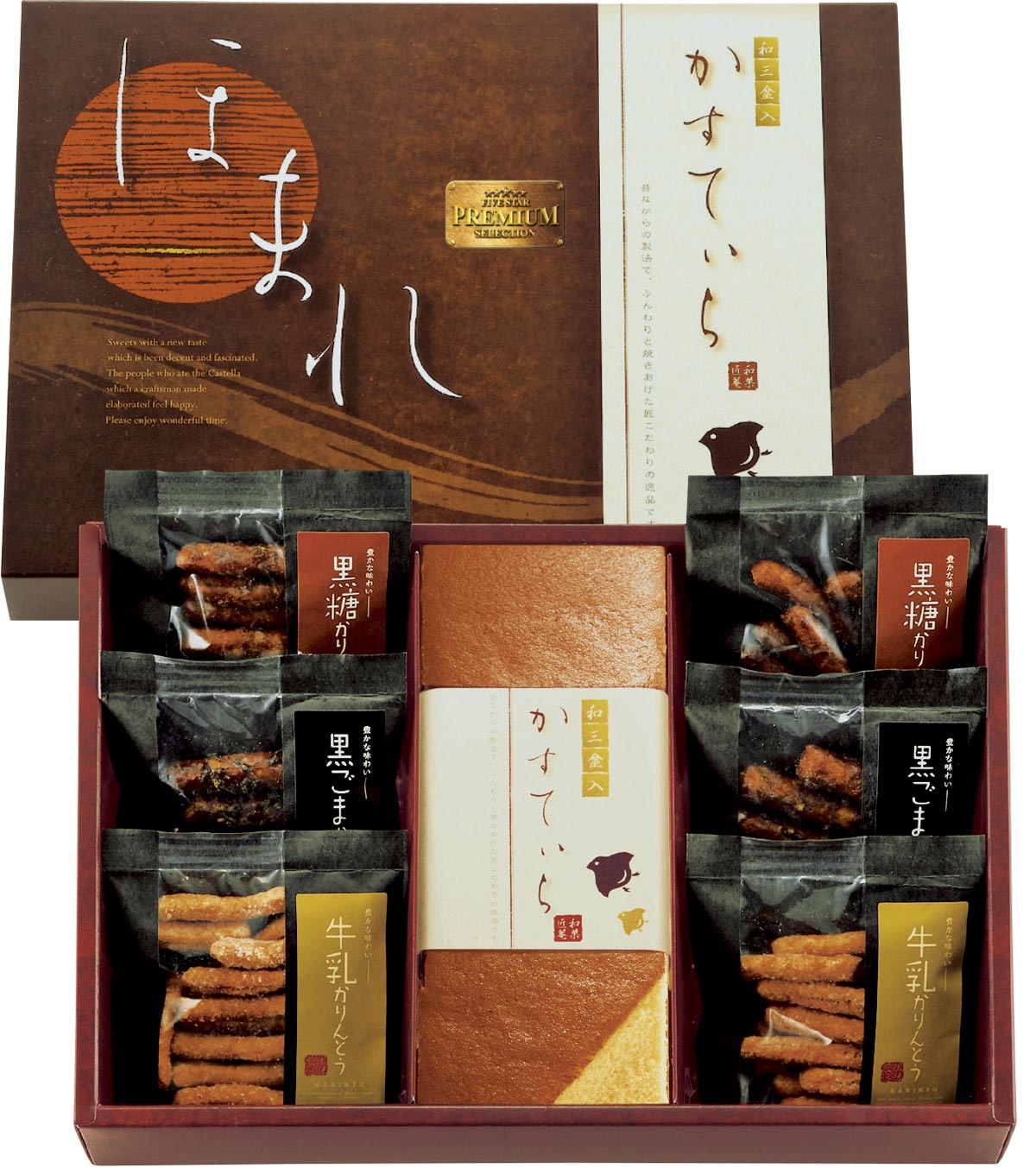 商品内容:和三盆糖入かすてぃら(プレーン)1本・かりんとう(黒糖・黒胡麻・牛乳)15g×各2 【卵・乳成分・小麦】