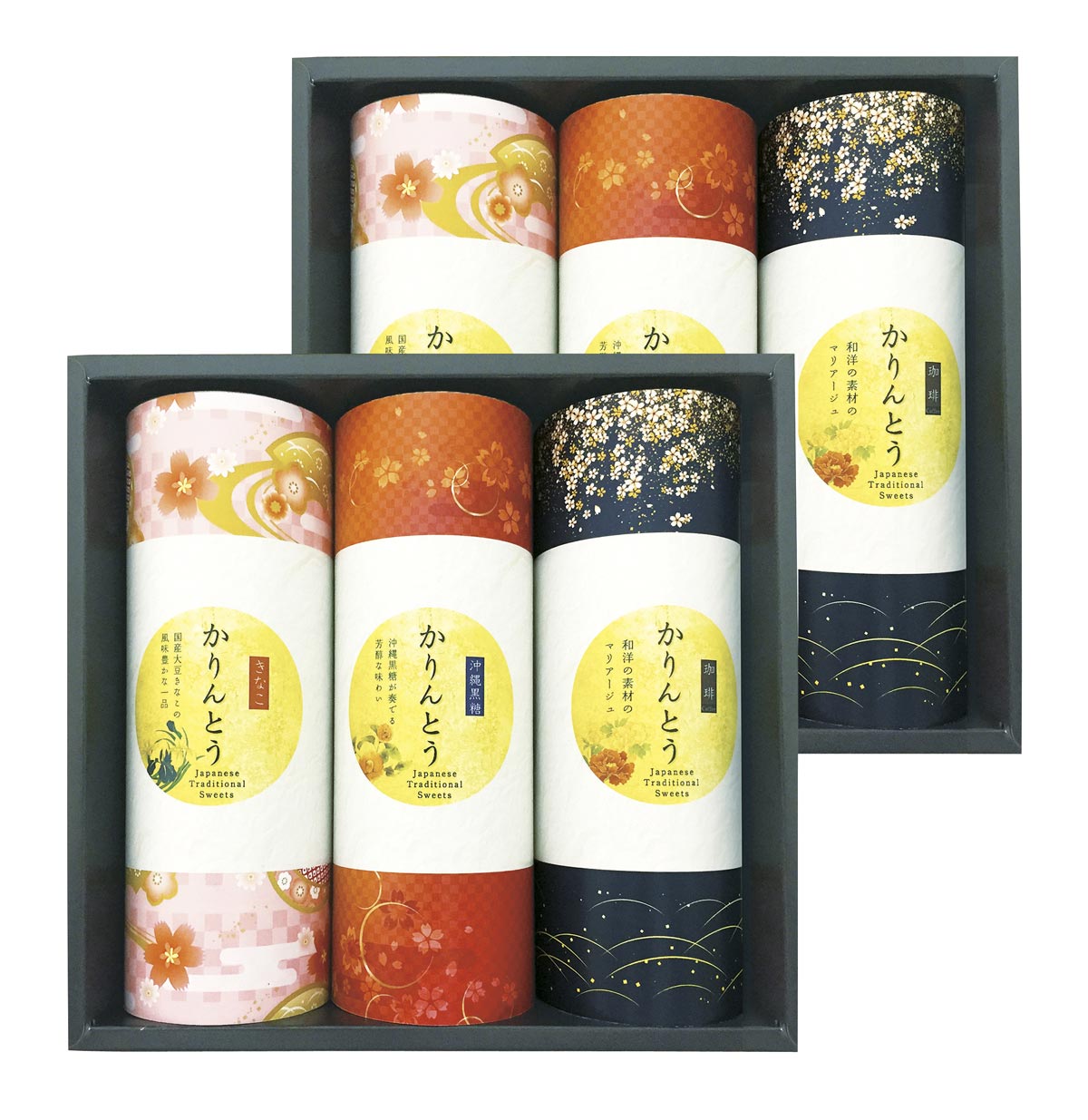 国産きなこをまぶし、甘さを抑え少し塩味に仕上げた懐かしい味のきなこかりんとうと、昔ながらの定番の味、クセになる美味しさの風味豊かな黒かりんとう、珈琲の香ばしさが甘みを引き立ててくれる大人味の珈琲かりんとう、沖縄産黒糖を使用した黒糖の風味が広がる、ツヤが美しい沖縄黒糖かりんとうの詰合せです