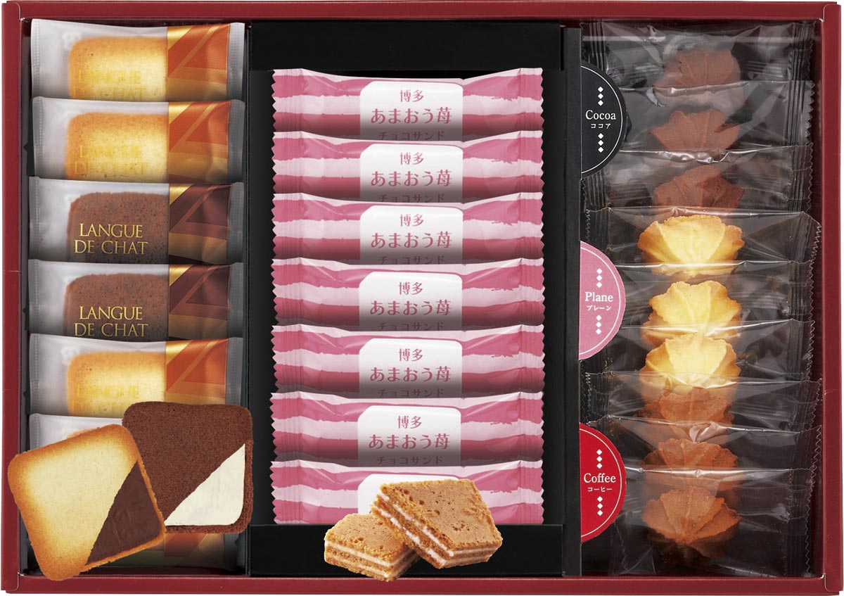 福岡名産あまおうを使用した、ほどよい甘さの「博多あまおう苺サンド」に、サクッとした食感のクッキーにホワイトクリーム・チョコレートクリームをサンドした「ラングドシャ」、プレーン・ココア・コーヒー3種類の味が楽しめる可愛らしい「絞りクッキー」の詰合せ