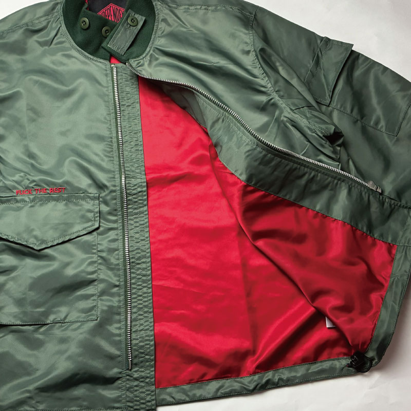 左ポケット下にブランド織ワッペン、右ポケット上にブランドスローガン「FUCK THE REST」。