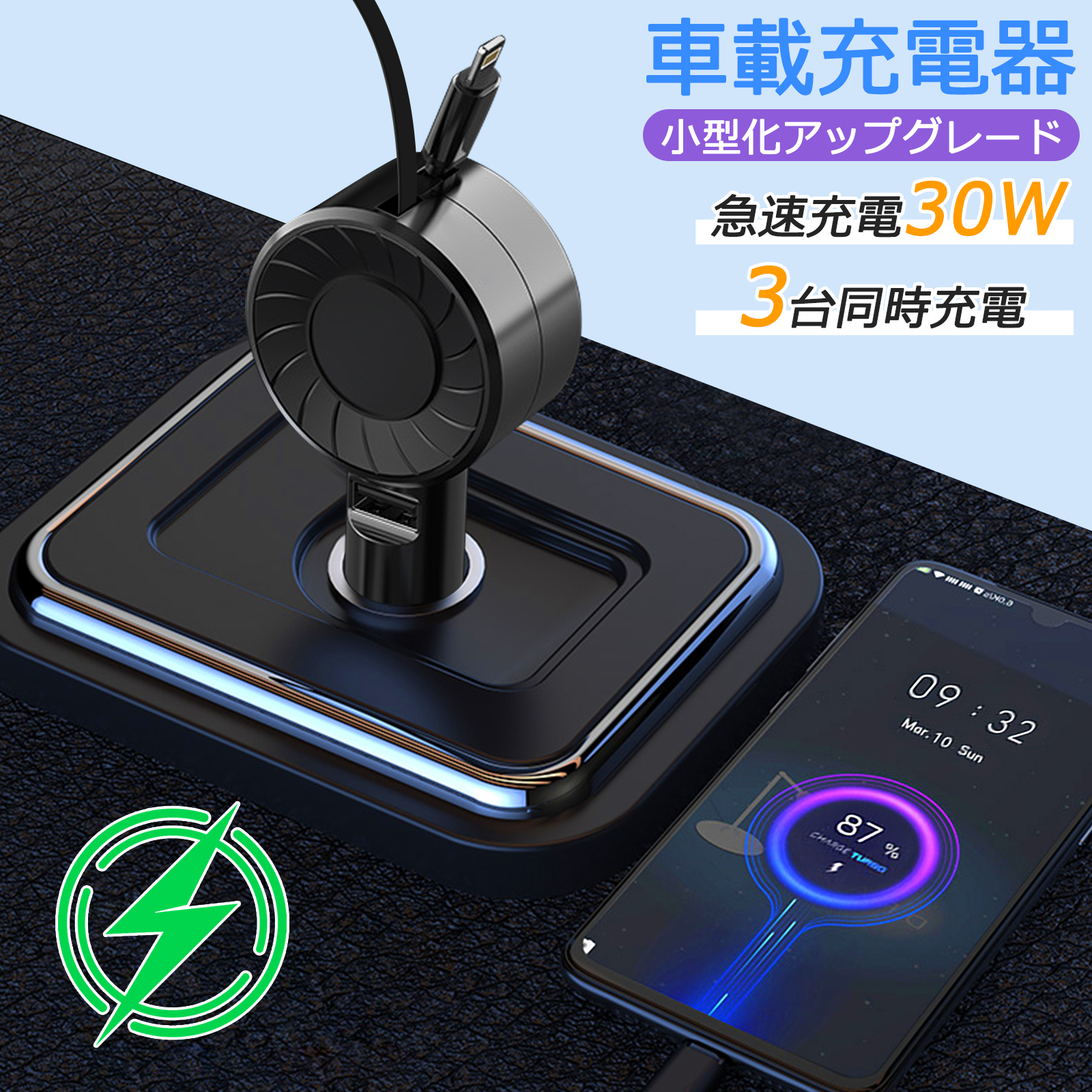 車載充電器 小型 シガーソケット 車 充電器 巻き取り式 急速充電対応 ケーブル付き カーチャージャー 3ポート type-c Lightning