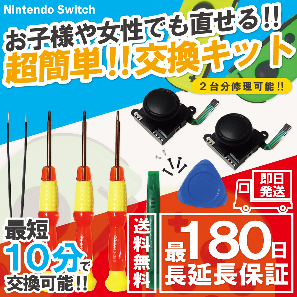 こちらの商品はNintendo SwitchのJoy-conスティック修理キットになります。 「こんなことありませんか?」 ・スティックを触っていないのに勝手に動く ・操作している方向に動かない ・ゴムが劣化している、または汚れが目立つ でもメーカーへ修理に出すと時間がかかるし、その間遊べない… 大丈夫です! Joy-conのスティックは自分でも直せるんです! 交換方法も単純で簡単。 お子様もお父さんもお母さんも、だれでも簡単に交換できます! 交換方法は動画サイトなどで、 「Joy-conスティック 交換」 など打ち込んで検索すれば、参考になる動画がたくさん出てきます。 またスティックは左右同じ部品なので、左右で取り付ける方を間違えるなどといった心配もありません。 初心者の方でも簡単に取り換えることができます。 ▽よろしければこちらもご覧ください [ジョイコンスティック 1個] [ジョイコンスティック 2個セット] [ジョイコンスティック2個、Yドライバー、+ドライバー、バッテリー外し、ケース開けシールセット] [ジョイコンスティック2個、ピンセット、Yドライバー、+ドライバーセット] [ジョイコンスティック2個、ピンセット、Yドライバー、+ドライバー、バッテリー外し、ケース開けシール、ピンセット、ネジセット] 12in1セット☆[ジョイコンスティック2個、ピンセット、Yドライバー、+ドライバー、バッテリー外し、ケース開けシール、ピンセット、ネジセット、バッテリー外し、刷毛、ジョイコンカバー6個] 交換の際に必要なキットもついているので、届いたらすぐに作業を始められます! ジョイコン関連商品の一覧はこちら