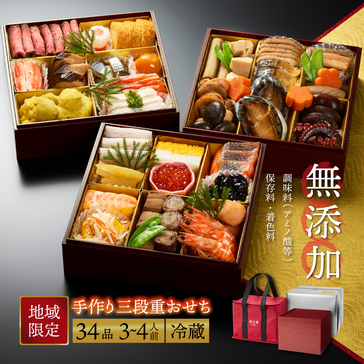 【完売御礼】惣菜 おかず | おせち料理 冷蔵 知久屋 | おせち 2026 三段重 34品 3〜4人前ちくや お節 御節 手作り 無添加 健康 惣菜 お取り寄せ 配達エリア限定