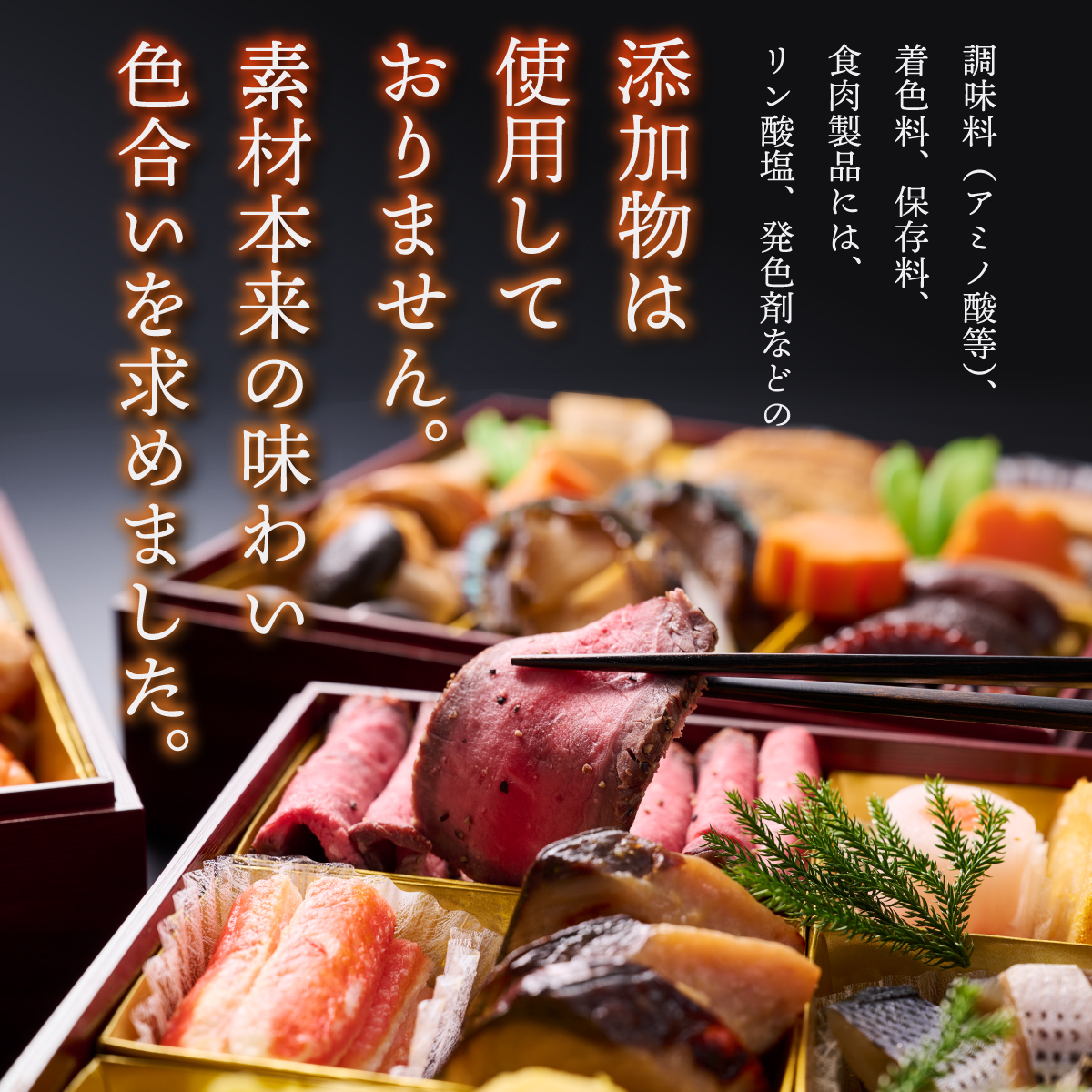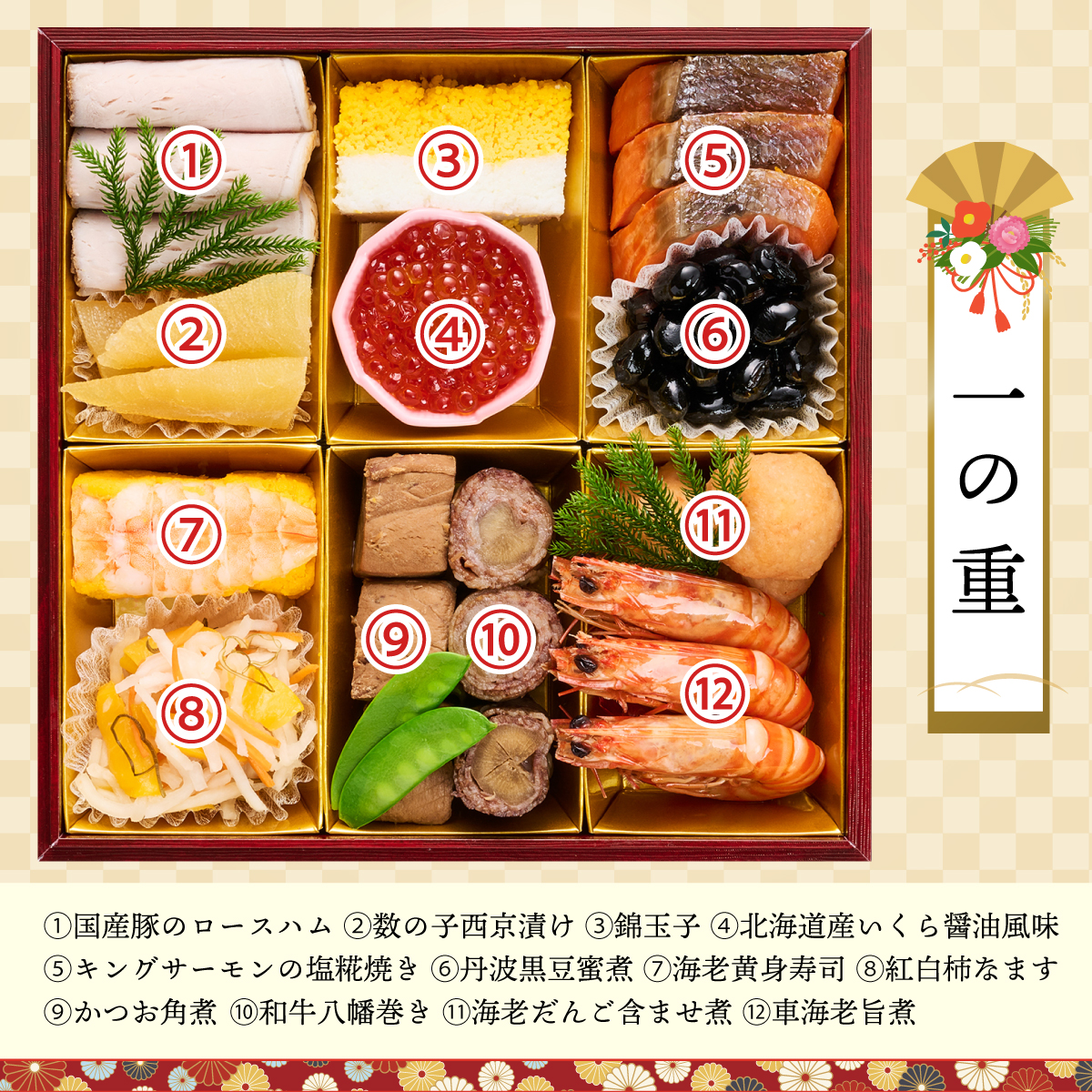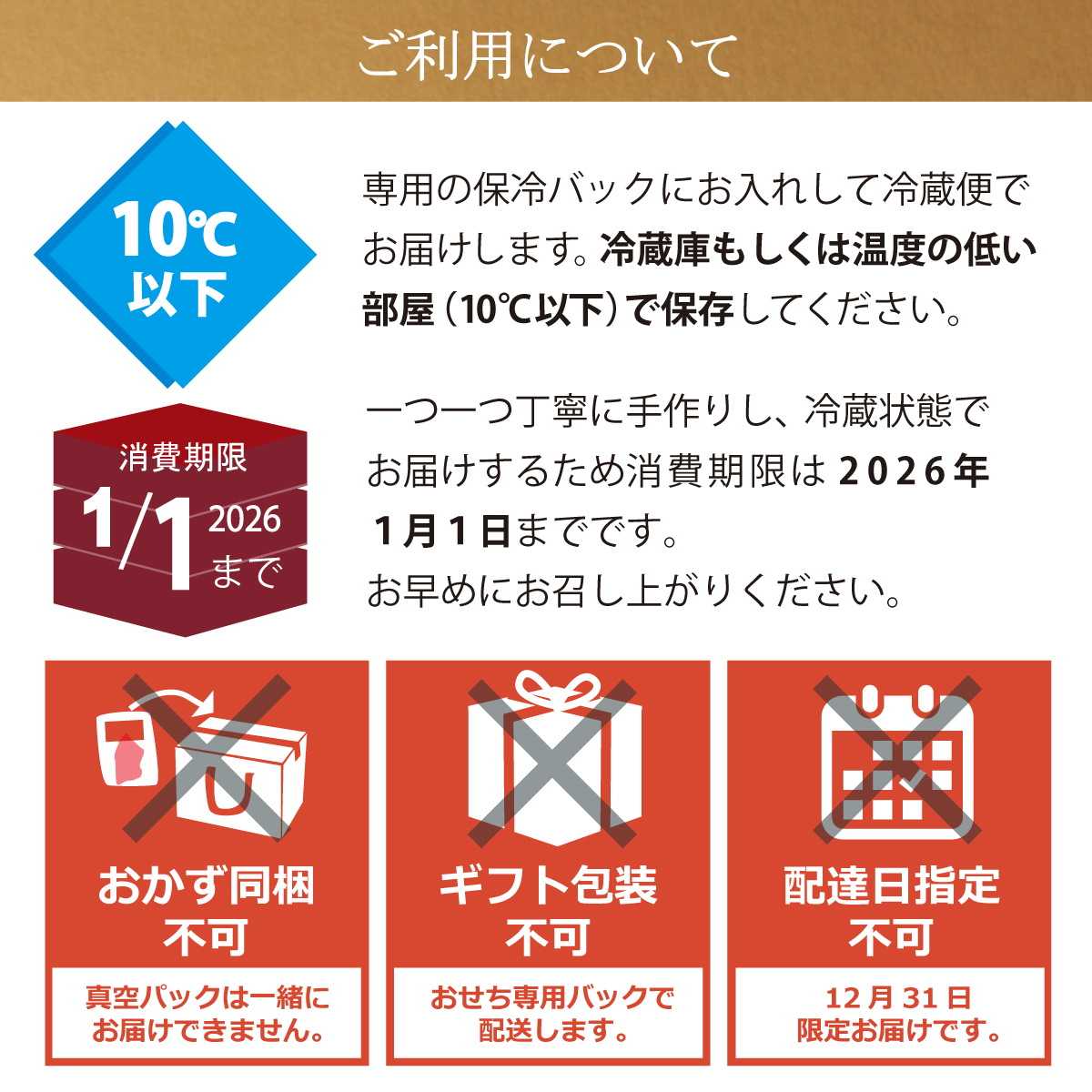 ※冷蔵庫または温度の低い部屋(10℃以下)で保管し、1月1日中にお召し上がりください。お重に詰めたてのものを12日31日にお届けします。