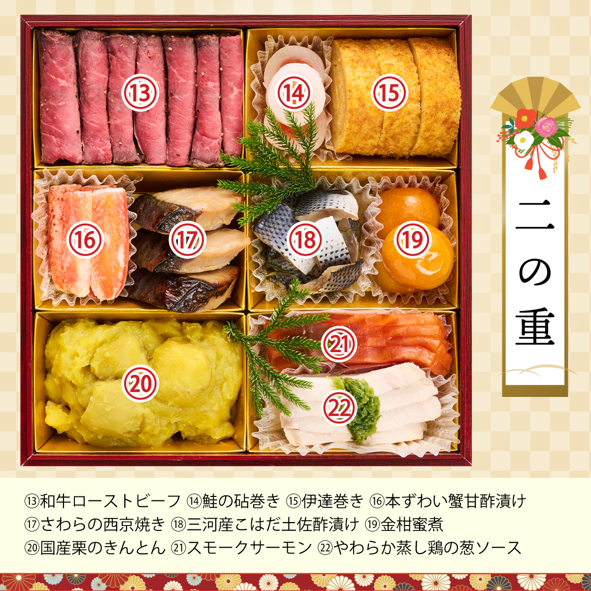 原材料・特定原材料等・栄養成分表示一覧はこちら ≫手作り三段重おせち(地域限定)の内容 全34品