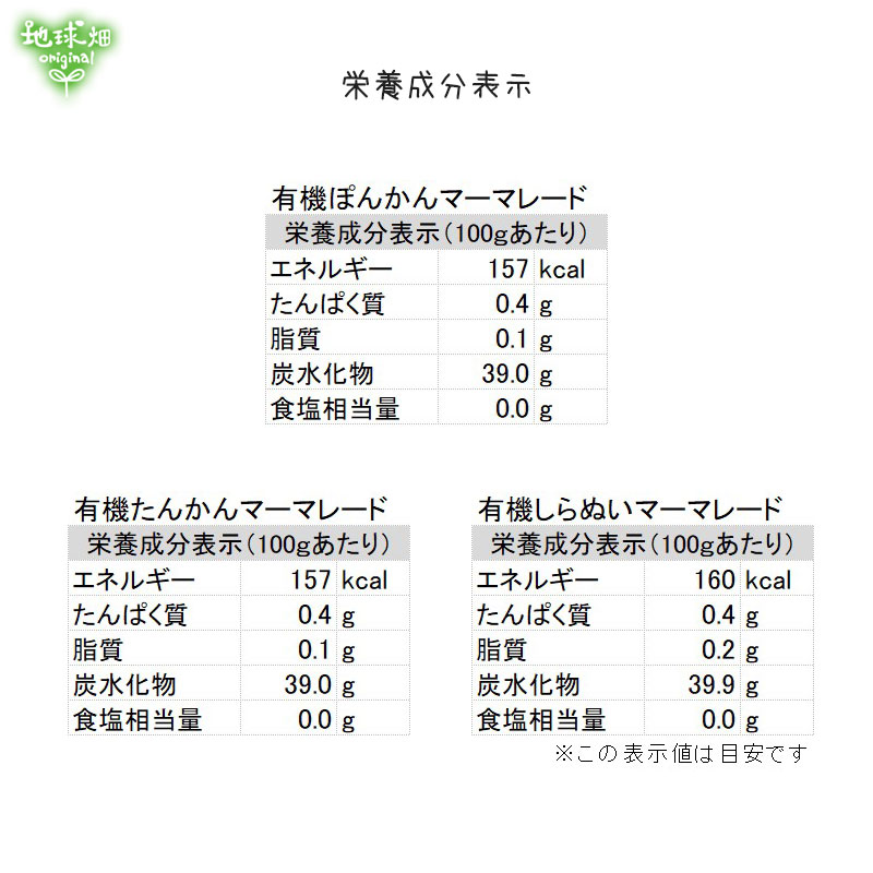 | 原材料名 | 有機ぽんかん(鹿児島県産)、有機たんかん(鹿児島県産)、有機しらぬい(熊本県産)、有機砂糖、有機レモン果汁、さつま芋澱粉 |
