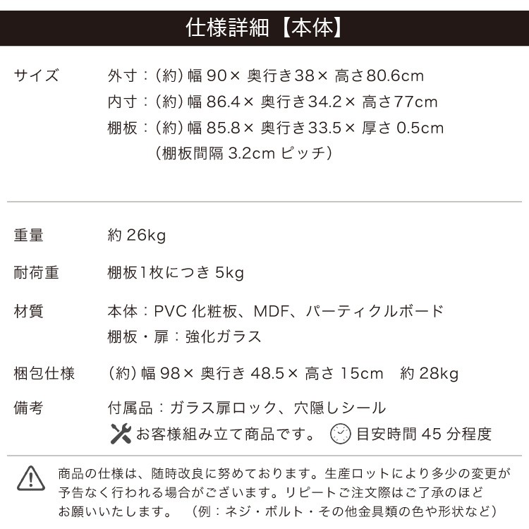 | 付属品 | ・ガラス棚板は2枚付属します。 ・その他:ガラス扉ロック、穴隠しシール |