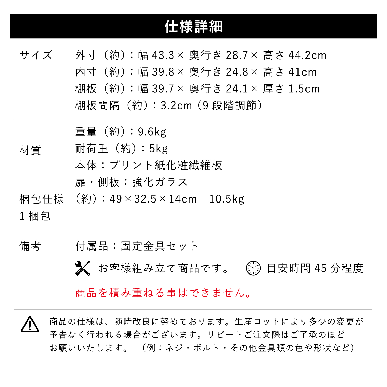 | 付属品 | 棚板2枚、固定金具セット |
