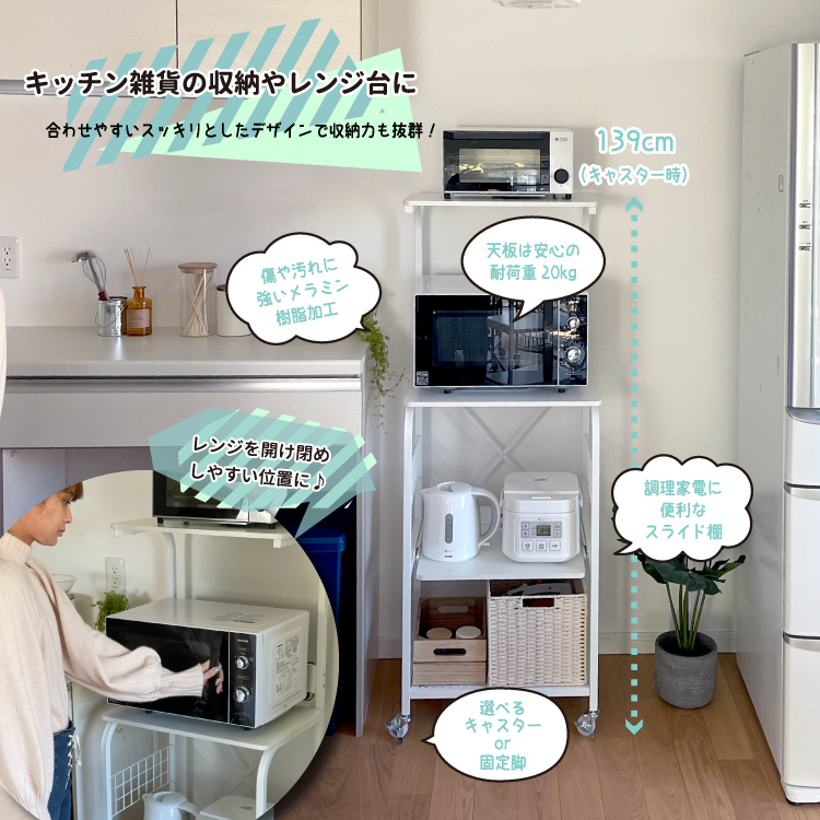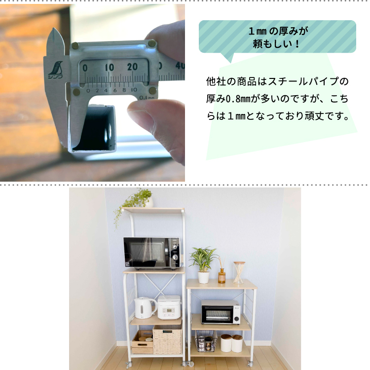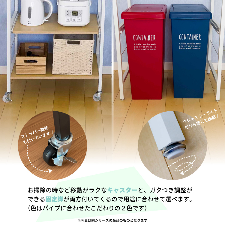 | 1.傷や汚れに強いメラミン樹脂 2.キャスターか固定脚どちらでも使用可能(色はパイプにあわせたこだわりの2色、脚はアジャスター機能付でぐらつきを防止) 3.便利なスライド棚機能 4.あわせやすいスッキリとしたデザインで収納力も抜群 |