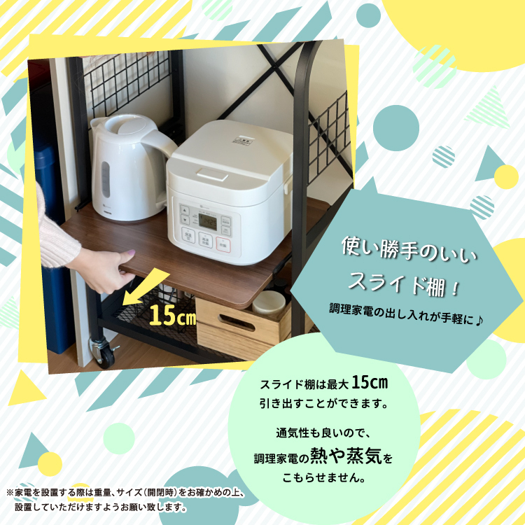 | 耐荷重 | 上棚:5kg 天板:20kg スライドテーブル:5kg 下棚:15kg |