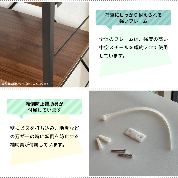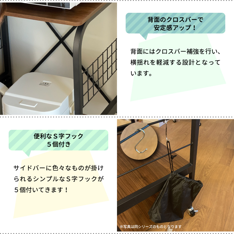 | 製品特徴 | 1.耐荷重20kgの天板 2.固定設置時の転倒防止バンド付 3.便利なフック5点付 4.背面にクロスバーを付けて安定感をUP |