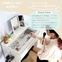 | 引き出しのある化粧台にスツールがセットになったドレッサーセット。 スツールは座面カバーを取り外せば、引き出しに入りきらない道具や小物もたくさん収納できます。 スツールにはティッシュボックススペースがあるので、収納・取り出しがしやすく便利!多機能でおしゃれなドレッサーです。 ☆丈夫な強化ガラスを使用した天板 ☆ちょっとした作業にも十分な広さ ☆車のフロントガラスなどに採用される強化ガラス仕様 ☆天板に付いた汚れもサッと簡単に掃除ができます |