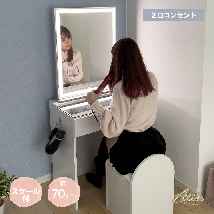 | 【ドレッサー】 ☆丈夫な強化ガラスを使用した天板 ☆ちょっとした作業にも十分な広さ ☆車のフロントガラスなどに採用される強化ガラス仕様 ☆天板に付いた汚れもサッと簡単に掃除ができます 【女優ミラー】 ★スマートタッチセンサー機能、調整可能な明るさの照明。暖かい暖色と昼光色、昼白色を3段階で自由に変えることができます。 ★メモリー機能付きで、ミラーに明るさの設定を記憶させます。 ★シームレスなアルミフレームにより、ミラーはより高級で美しくなります。 ★最高品質の素材で長持ちするように作られたゴージャスで優れたミラー。 ・アルミフレーム ・12VのDCプラグインによる電力 ・3つのタッチスイッチ ・全周を覆う3カラーLEDバー ・無段階の調光機能 |