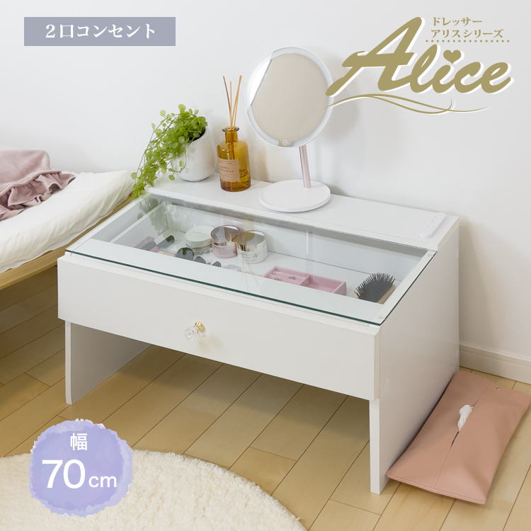 | 一人暮らしにおすすめ★コンパクトなロータイプです。 小型のミラーを置いてドレッサーとして使うことはもちろん、引き出し、コンセントも付属しているのでノートパソコンを使ったり、ちょっとしたテーブルとしても使える便利でかわいいアイテムです。 ☆丈夫な強化ガラスを使用した天板 ☆ちょっとした作業にも十分な広さ ☆車のフロントガラスなどに採用される強化ガラス仕様 ☆天板に付いた汚れもサッと簡単に掃除ができます |