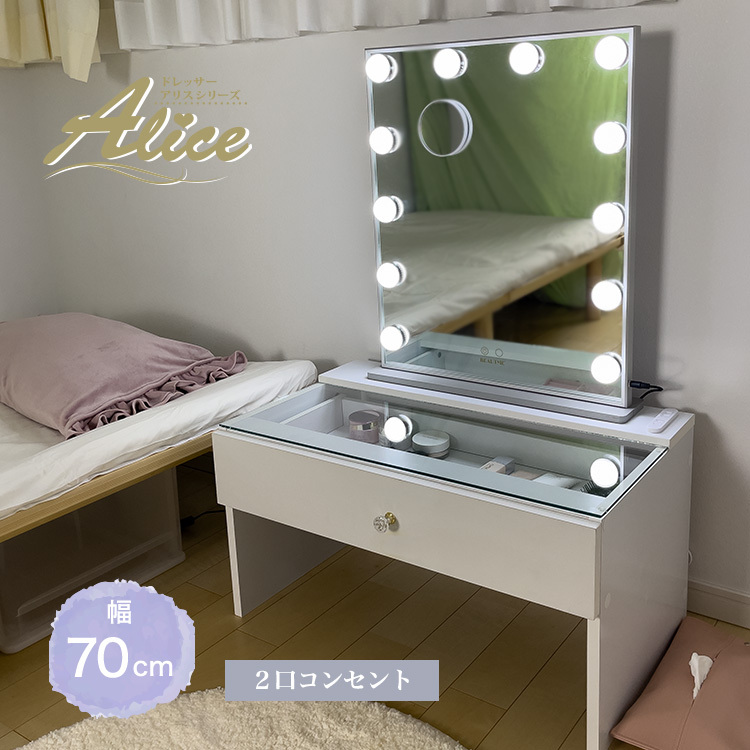 | 【ドレッサー】 一人暮らしにおすすめ★コンパクトなロータイプです。 小型のミラーを置いてドレッサーとして使うことはもちろん、引き出し、コンセントも付属しているのでノートパソコンを使ったり、ちょっとしたテーブルとしても使える便利でかわいいアイテムです。 ☆丈夫な強化ガラスを使用した天板 ☆ちょっとした作業にも十分な広さ ☆車のフロントガラスなどに採用される強化ガラス仕様 ☆天板に付いた汚れもサッと簡単に掃除ができます 【女優ミラー】 ★スマートタッチセンサー機能、調整可能な明るさの照明。暖かい暖色と昼光色を自由に変えることができます。 ★メモリー機能付きで、ミラーに明るさの設定を記憶させます。 ★シームレスなアルミフレームにより、ミラーはより高級で美しくなります。 ★最高品質の素材で長持ちするように作られたゴージャスで優れたミラー。LED電球の寿命は50,000時間です。 ・アルミフレーム ・12VのDCプラグインによる電力 ・2つのタッチスイッチ ・12個のデュアルカラーLED電球 ・無段階の調光機能 |