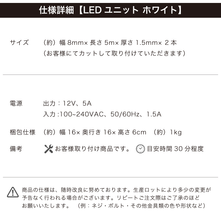 | 注意事項 | ※商品の仕様は、随時改良に努めております。生産ロットにより多少の変更が予告なく行われる場合がございます。リピートご注文際はご了承のほどお願いいたします。(例:化粧板の柄や色味・ネジ・ボルト・その他金具類の色や形状など) ※運送会社の配送中に外装箱に汚れが付く場合がありますが、商品は新品の良品ですのでご了承ください。 ※ホワイトLEDの色味と比較するとRGBマルチカラーLEDのホワイトは若干青みがかったホワイトです。 ※お客様で組み立てが必要な商品です。(目安時間30分程度) ※商品の色や質感は撮影時の光加減やモニタ画面により異なります。 ※同シリーズ内でカラーやサイズ、オプション品等の種類が多い為、お間違いにご注意ください。 |