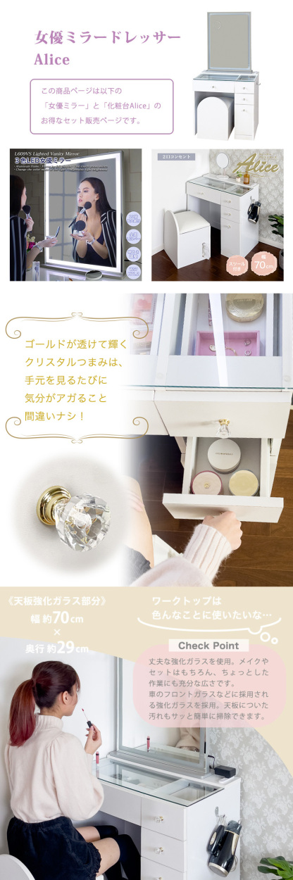 ![]() ドレッサー引出し7杯 ワイドタイプ | ![]() ドレッサー引出し7杯+ハイタイプ+女優ミラーLED14個セット | ![]() ドレッサー引出し7杯+ハイタイプ+女優ミラーLED12個セット |