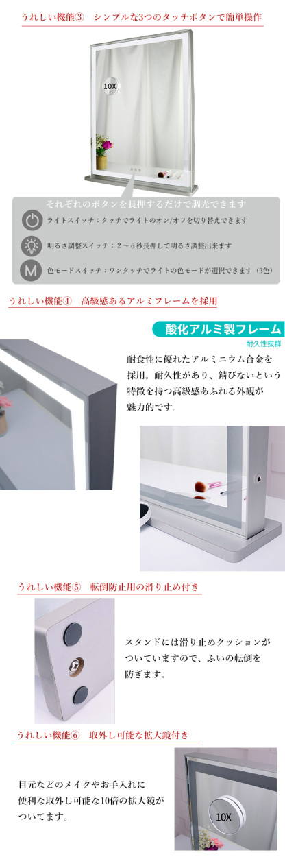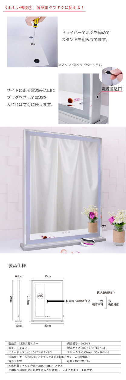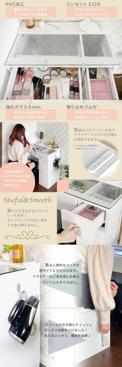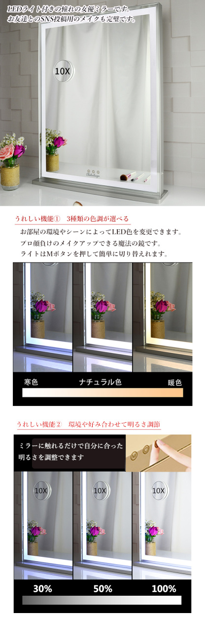 | 【ドレッサー】 ☆丈夫な強化ガラスを使用した天板 ☆ちょっとした作業にも十分な広さ ☆車のフロントガラスなどに採用される強化ガラス仕様 ☆天板に付いた汚れもサッと簡単に掃除ができます 【女優ミラー】 ★スマートタッチセンサー機能、調整可能な明るさの照明。暖かい暖色と昼光色、昼白色を3段階で自由に変えることができます。 ★メモリー機能付きで、ミラーに明るさの設定を記憶させます。 ★シームレスなアルミフレームにより、ミラーはより高級で美しくなります。 ★最高品質の素材で長持ちするように作られたゴージャスで優れたミラー。 ・アルミフレーム ・12VのDCプラグインによる電力 ・3つのタッチスイッチ ・全周を覆う3カラーLEDバー ・無段階の調光機能 |