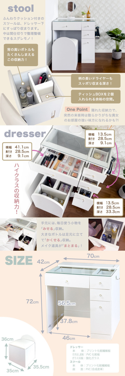 | 材質 | 【ドレッサー】 本体:プリント化粧繊維板 引出し前板:PVC化粧板 天板:強化ガラス 【スツール】 本体:プリント化粧繊維板 座面:PVC(合成皮革) |
