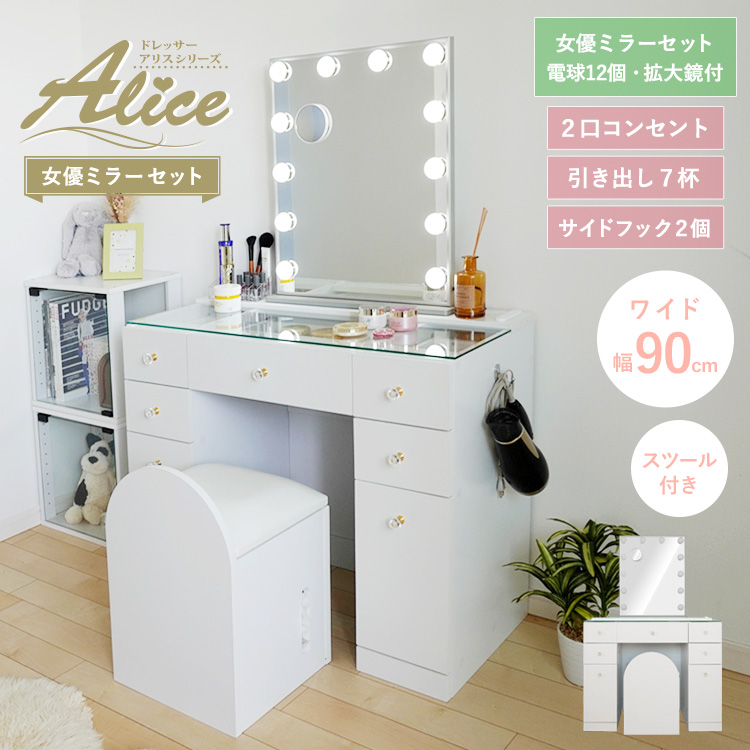 | スツール付き 化粧台 ドレッサー 引出し7杯 ハイタイプ 電球12個LEDライト幅52cmセット |