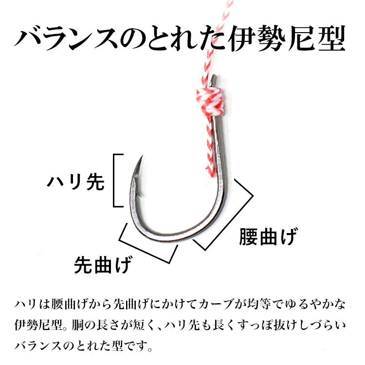 | ◇細身フックでショートバイトを掛ける。底をこまめに取るフックは想像以上に消耗が激しい。こまめに確認し刺さりが悪くなったと思ったらすぐ交換。釣果に決定的な差が出ます。 ◇バランスの取れた伊勢尼型ハリは腰曲げからの先曲げにかけてカーブが均等でゆるやかな伊勢尼型。胴の長さが短く、ハリ先も長くすっぽ抜けしづらいバランスのとれた型です。 ◇バクストがタイラバ用に厳選した各種ネクタイ(別売)と専用タイラバ用スイベル(別売)を使用して自分のフィールドに合ったタイラバにカスタマイズして楽しもう! ※商品の色や質感は撮影時の光加減やモニタ画面により異なります。 |