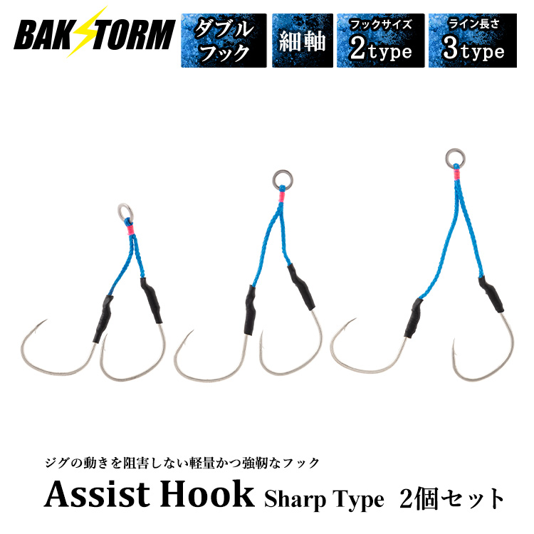 アシストフック シャープタイプ 細軸 ダブルフック 2本入り メタルジグ ルアー ジグ カンパチ ブリ 太刀魚 サワラ BAKSTORM バクスト