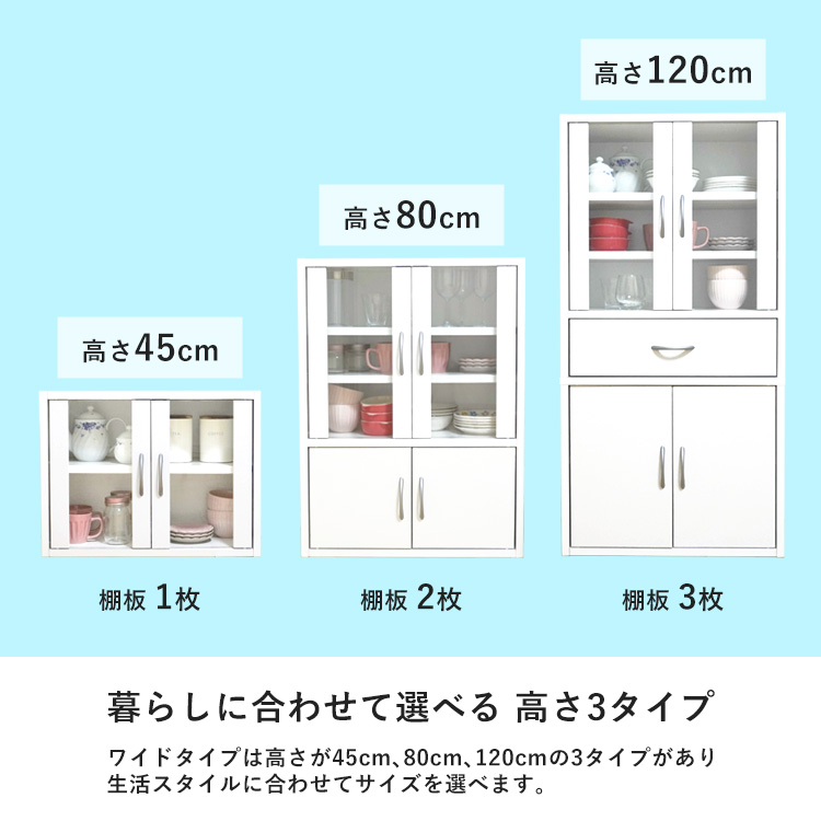 | ・一人暮らしのお部屋でも使いやすいワイド食器棚 ・幅60cm、奥行28cmのコンパクトサイズ ・食器のサイズに合わせて調整できる可動棚付き ・見せる収納ができるガラス扉 ・収納したものが取り出しやすい両開き扉 |
