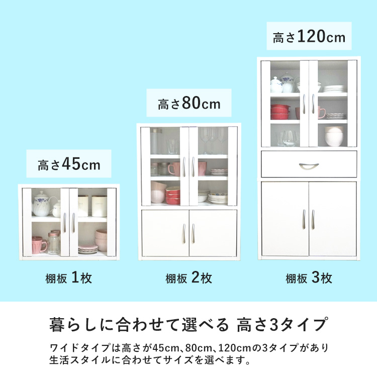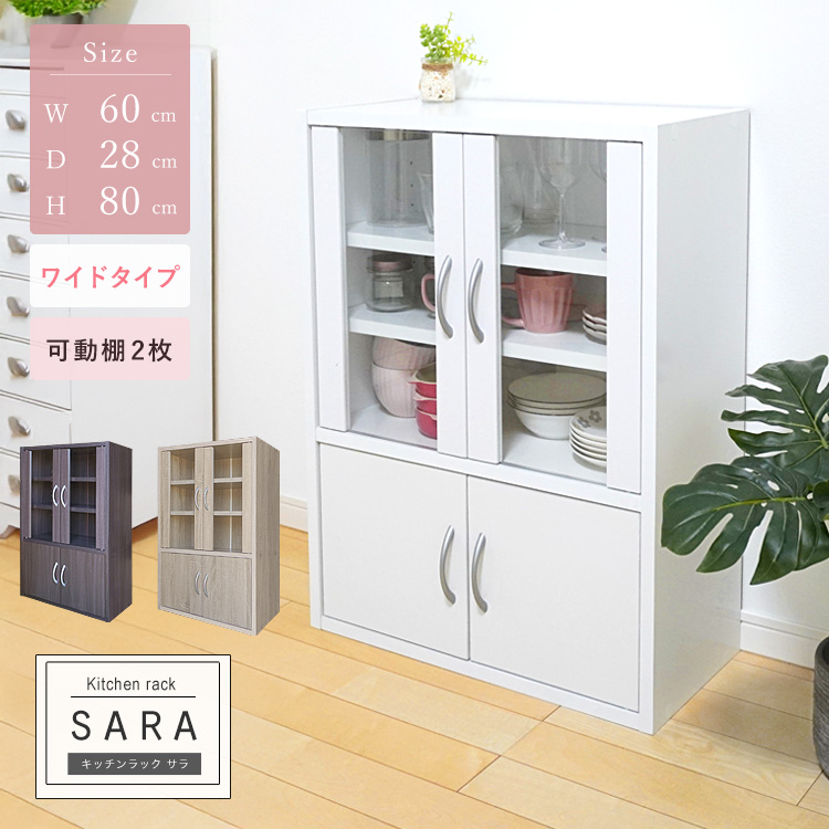 | ・一人暮らしのお部屋でも使いやすいワイド食器棚 ・幅60cm、奥行28cmのコンパクトサイズ ・食器のサイズに合わせて調整できる可動棚付き ・見せる収納ができる上段ガラス扉 ・下段扉にはストック等の隠したいものを収納 ・収納したものが取り出しやすい両開き扉 |