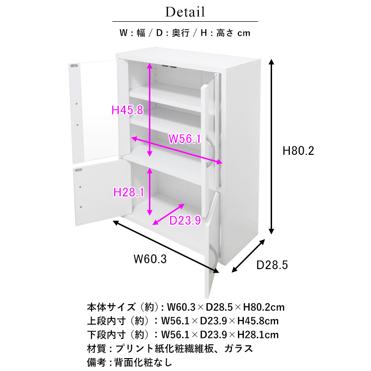 | 内寸 | 上段内寸(約):幅56.1×奥行23.9×高さ45.8(cm) 下段内寸(約):幅56.1×奥行23.9×高さ28.1(cm) |