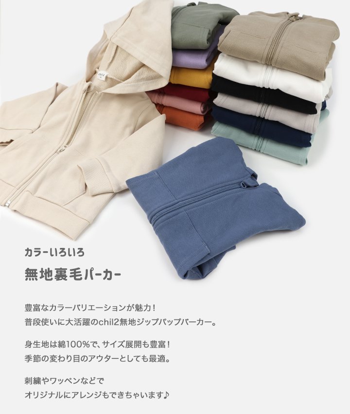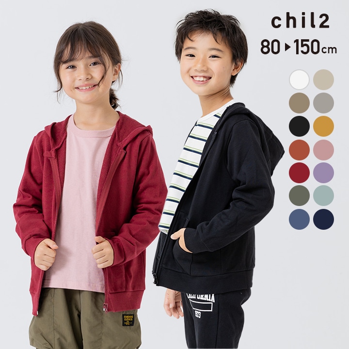 送料無料 在庫処分 キッズ パーカー ベビー服 子供服 無地 男の子 女の子 裏毛 綿100% フード ジップアップ 羽織り chil2 秋 80 90 100 110 120 130 140 150cm
