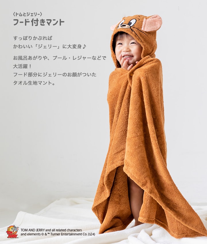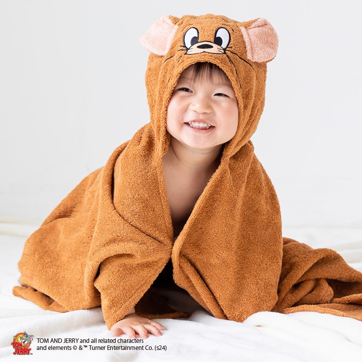 人気アニメーション「トムとジェリー」から、フード部分に「ジェリー」のフェイス刺しゅうがついたかわいいマント。