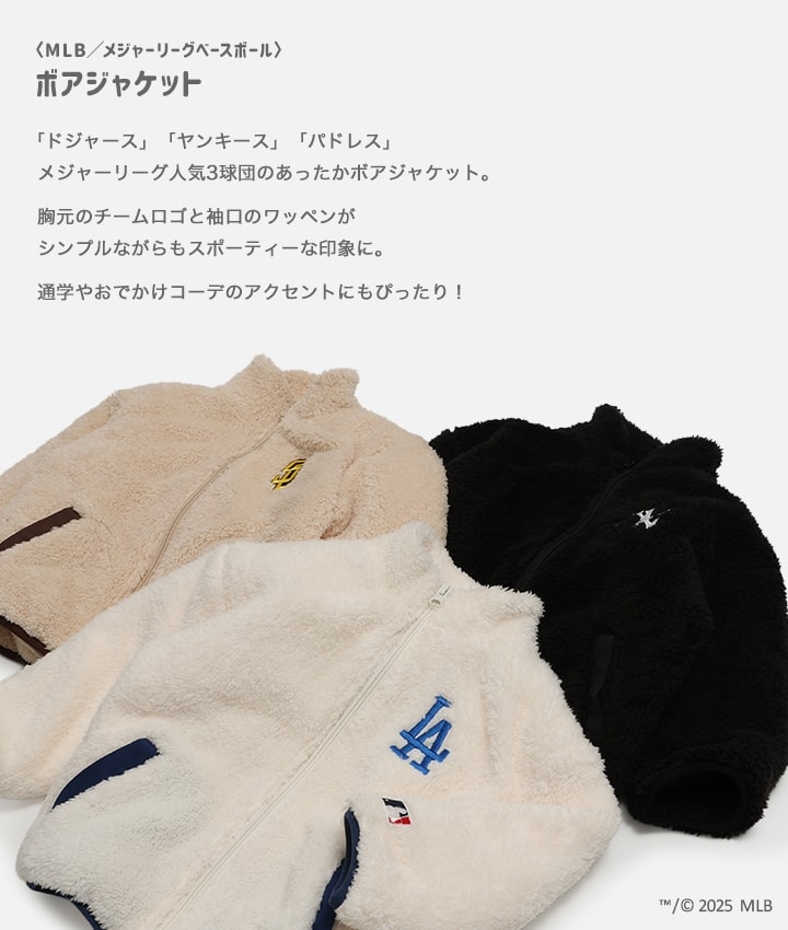 キッズ ボア ジャケット 子供服 アウター ジャンパー 長袖 無地 男の子 女の子 MLB 冬 ドジャース ヤンキース パドレス 100 110 120 130 140 150 160cm