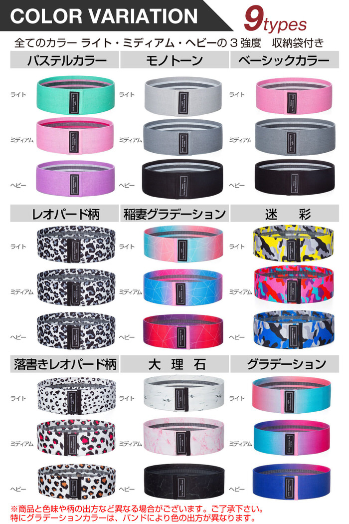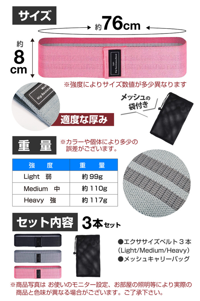 ■セット内容:ヒップバンド強度別3本(Light/Medium/Heavy)/メッシュキャリーバッグ