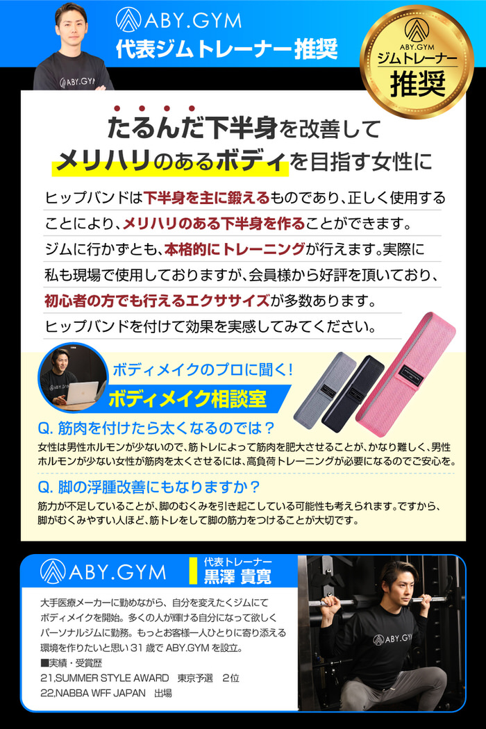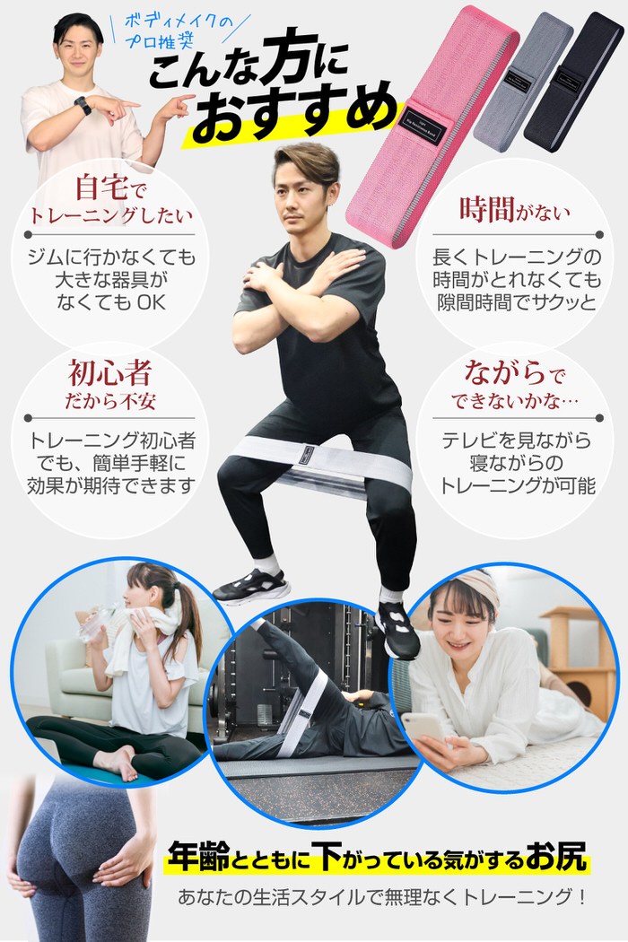 女性の方であれば、使い方次第で最近流行の美尻トレーニングもチューブでもちろん可能です。ダンベルやバーベルなどの器具を使わず、バンドのみで自重トレーニングのように、安心安全に鍛えることが可能です。是非、活用して美しい引き締まったボディを目指しましょう。