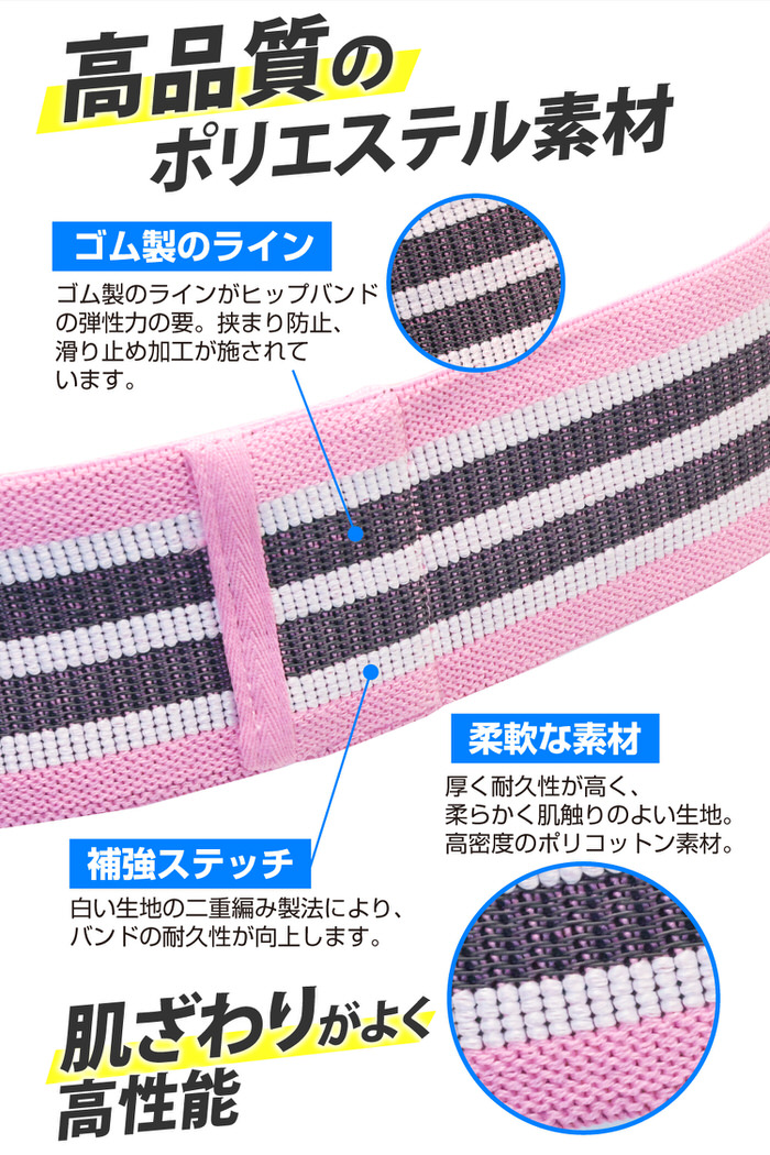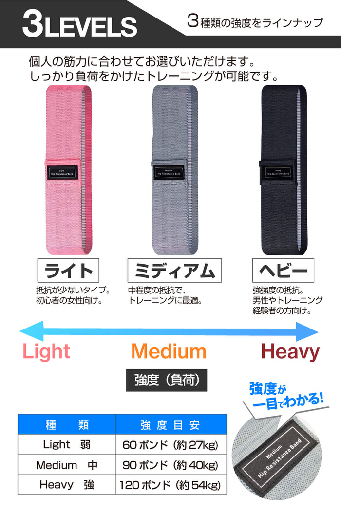 強度(負荷)3種類がセットになったエクササイズバンド。