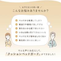 | 注意事項 | ●本製品はフラットベッドまたはマットレスはめ込み式ベッドに適しています。 ●大人用・介護用としては使用できません。 ●簡易式ベッド・リクライニング式ベッドには使用できません。 ●マットレスとベッドが一体化したものには使用できません。 ●すのこや網状のベッドは形状によって設置できる場合もございますが、安定性が確保できない場合は使用できません。 ●収納付きベッドに設置した場合、形状によってはぐらついたり収納機能に支障をきたす場合がございます。 ●ベビーベッド代わりに使用しないでください。 ●マットレスの厚さが25cmを超える場合は使用しないでください。厚すぎるとスタンドが正しく固定できません。 ●差し込みポケットの固定ボタンは必ず留めるようにしてください。 ●マットレスの厚さによってはクッションの上端からスタンドがはみ出る場合がございます。その場合はスタンド部分を布などで保護してください。 ●クッションとマットレスの間に隙間ができないようにぴったりと接触するように取り付けてください。正しく取り付けていないとお子さまが隙間に挟まってしまう場合がございます。 ●クッションに過度な力をかけたり、ゆすったりしないでください。また、お子さまがクッションの上に乗らないようにご注意ください。 ●定期的にクッションとスタンド、固定ベルトに緩みやガタつきがないか点検してください。 ●本製品はベッド上での事故を完全に防ぐものではございません。お子様の状態には注意をおこたらず、常に保護者の監督の元でご使用ください。 |