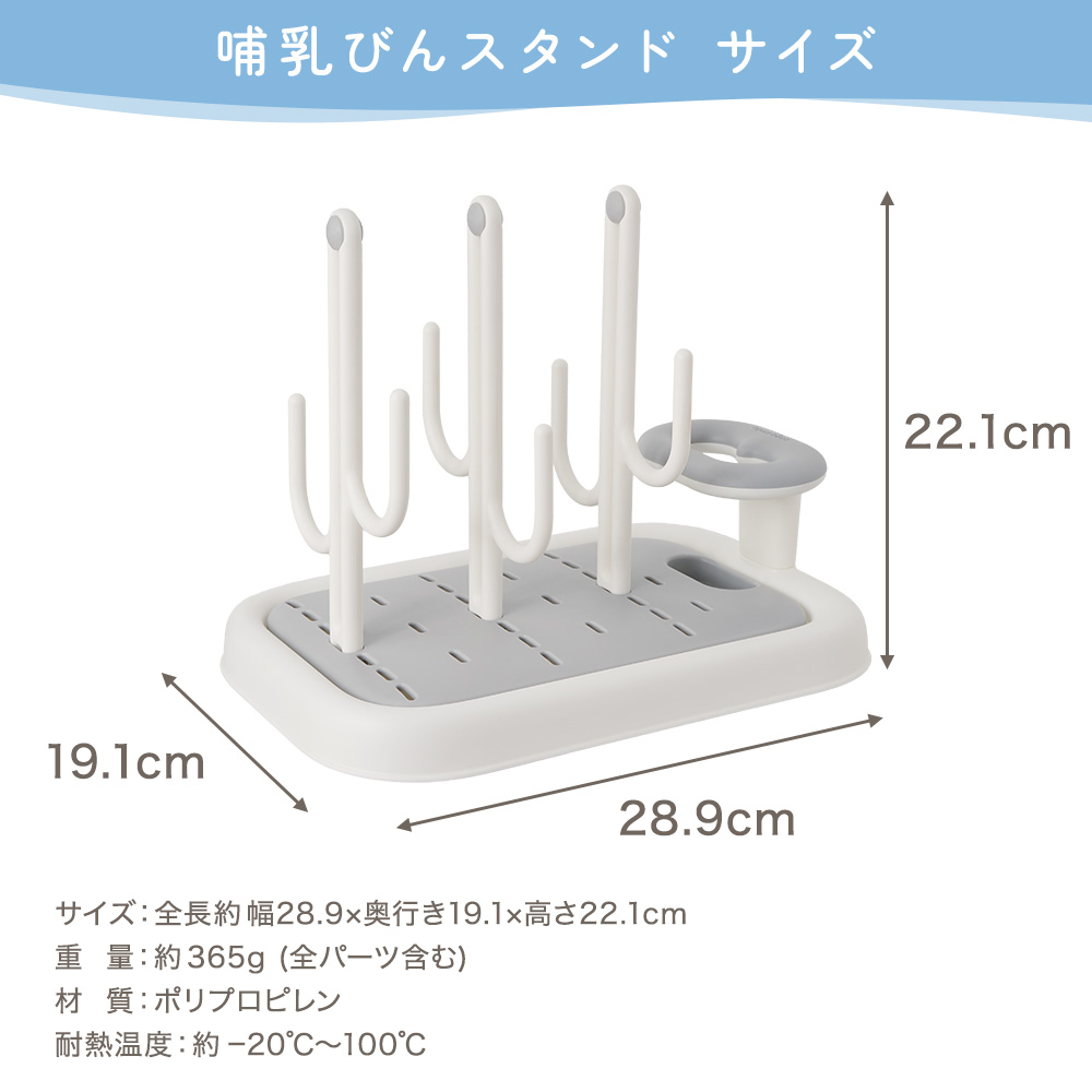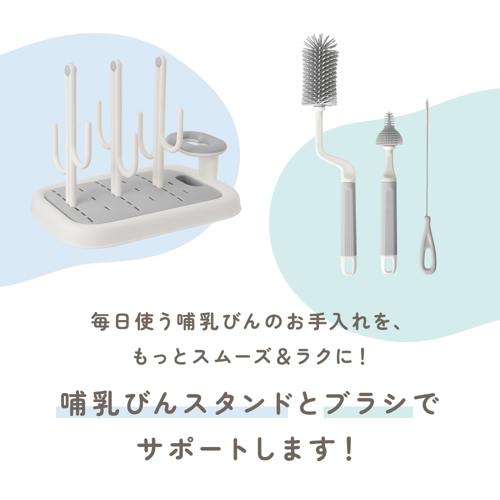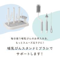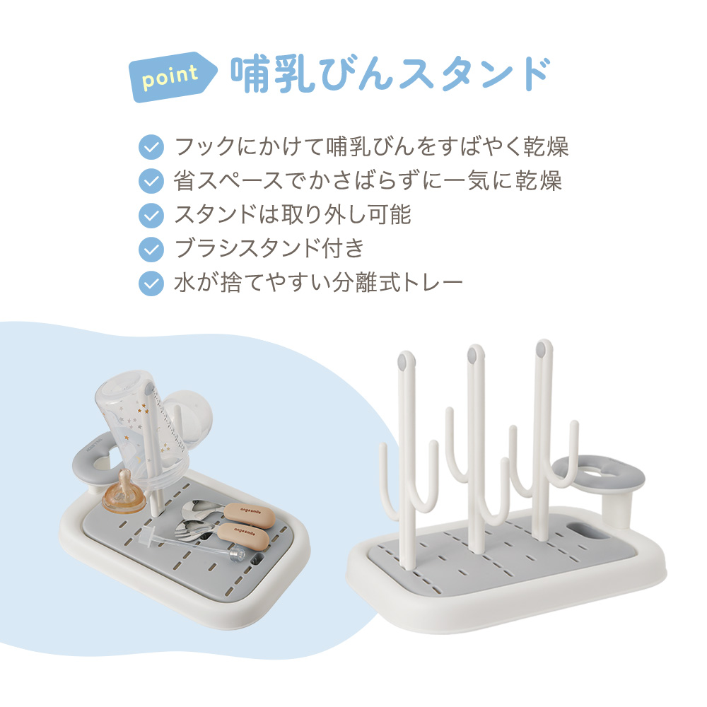 | 商品の特徴 | ・フックにかけて哺乳びんをすばやく乾燥。 ・省スペースで一度にたくさん乾燥できて見た目もスッキリ。 ・スタンドは取り外し可能で必要に応じて使い分け。 ・立てて乾かせるブラシスタンド付き。 ・水が捨てやすい分離式トレーでお手入れもかんたん。 ・哺乳びん以外にも対応で長く使える。 ・シンプルデザインでキッチンに合う清潔感のある色合い。 |