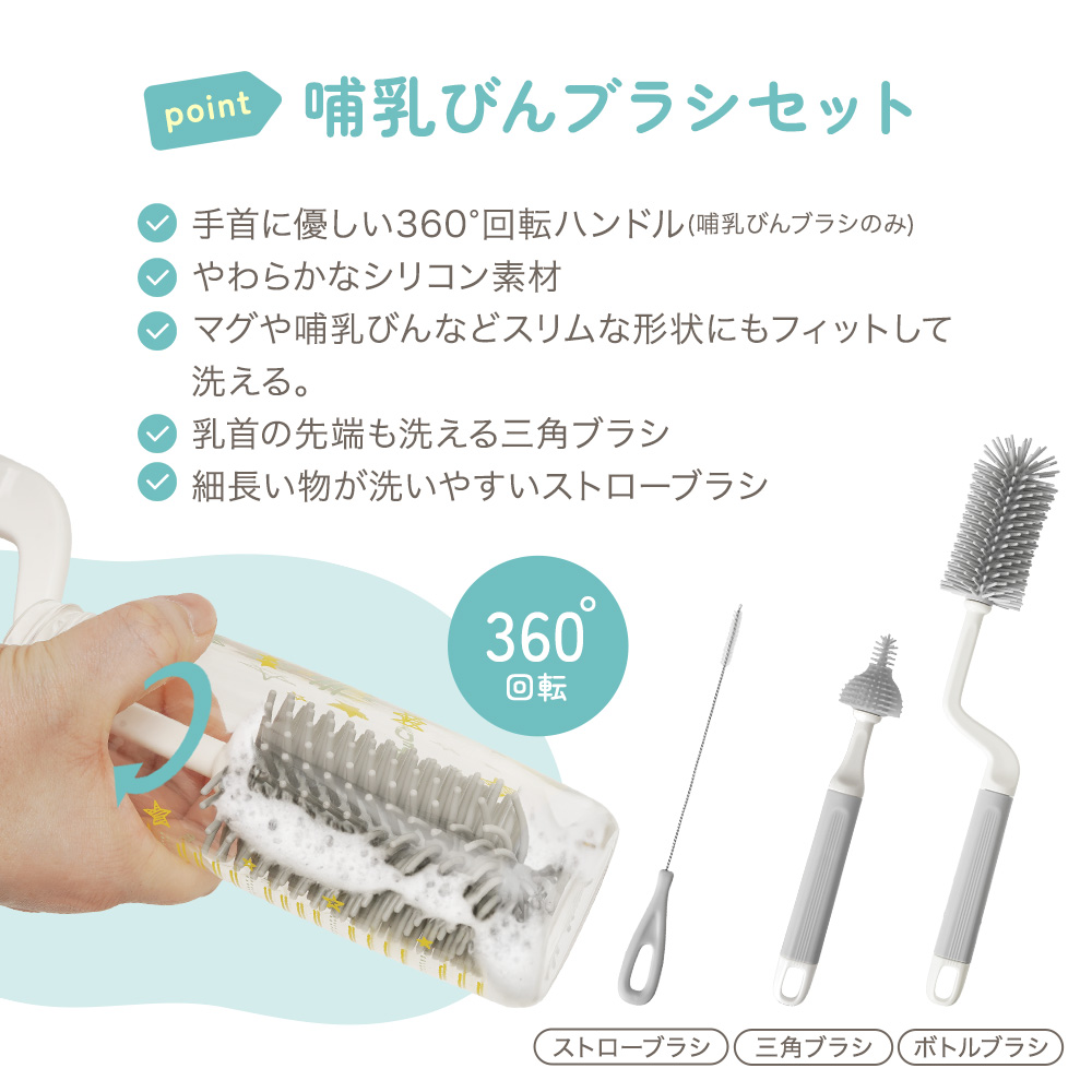 | 商品の特徴 | ・哺乳びん・乳首・ストローが洗えるブラシ3点セット。 ・やわらかなシリコン素材なので、繊細なパーツも傷つけずに洗えます。 ・ボトルブラシは柄の部分が360度回転することで、育児で酷使しがちな手首の動きをサポート。 ・三角ブラシは乳首の先端を洗うのに最適で、スポンジでは洗いにくい先細りの形状にしっかりフィット。 ・ストローブラシは細長い形状や小さな穴など、細かい部分までしっかり洗えます。※ストローブラシのみナイロン製 ・熱湯消毒可能で衛生的に使えます。 ・吊り下げできるので、スポンジと比べ乾燥しやすいのも嬉しいポイント。 |