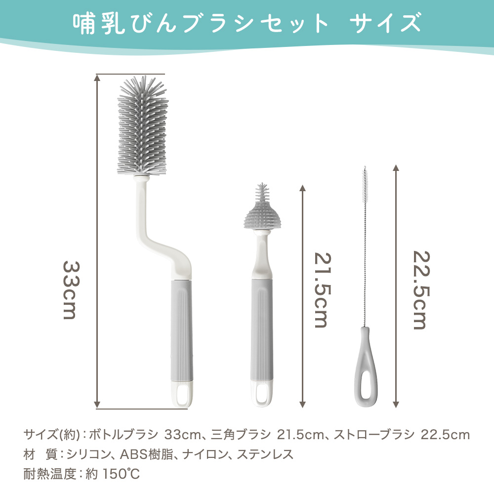 | サイズ | 【全長】約 ボトルブラシ:33cm、三角ブラシ:21.5cm、ストローブラシ:22.5cm |