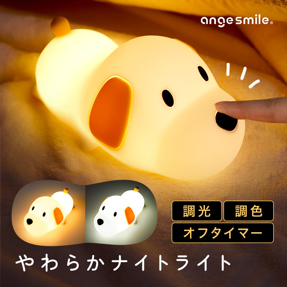 | 商品の特徴 | ・わんちゃんデザインのかわいいナイトライト ・鼻をタッチして明るさを調節 ・調色ができてお好みのライト色に変更OK ・やわらかなシリコン素材 ・オフタイマー機能を搭載 ・USBで簡単充電、ワイヤレスで使えます |