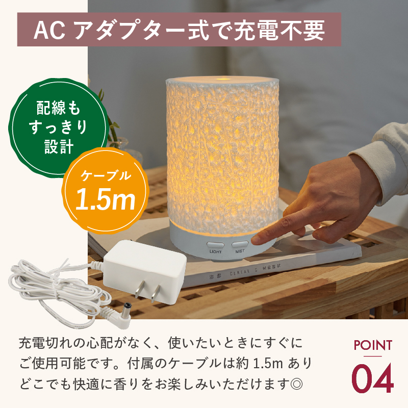 ・熱を使わずにミストを発生させるため、エッセンシャルオイルの成分を損なうことなく、自然な香りを広げることができます。