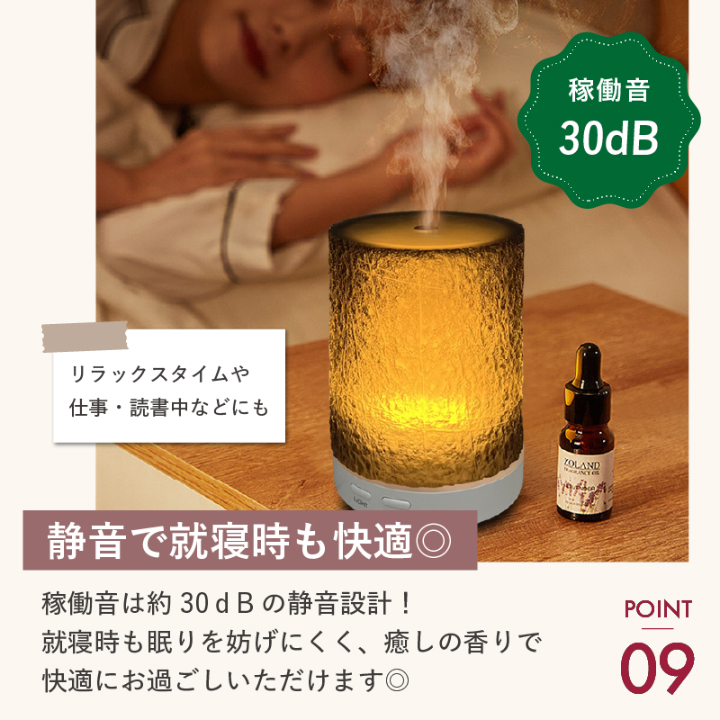 ・動作音が静かなので、寝室でも気にならず、リラックスしながら香りを楽しむことができます。
