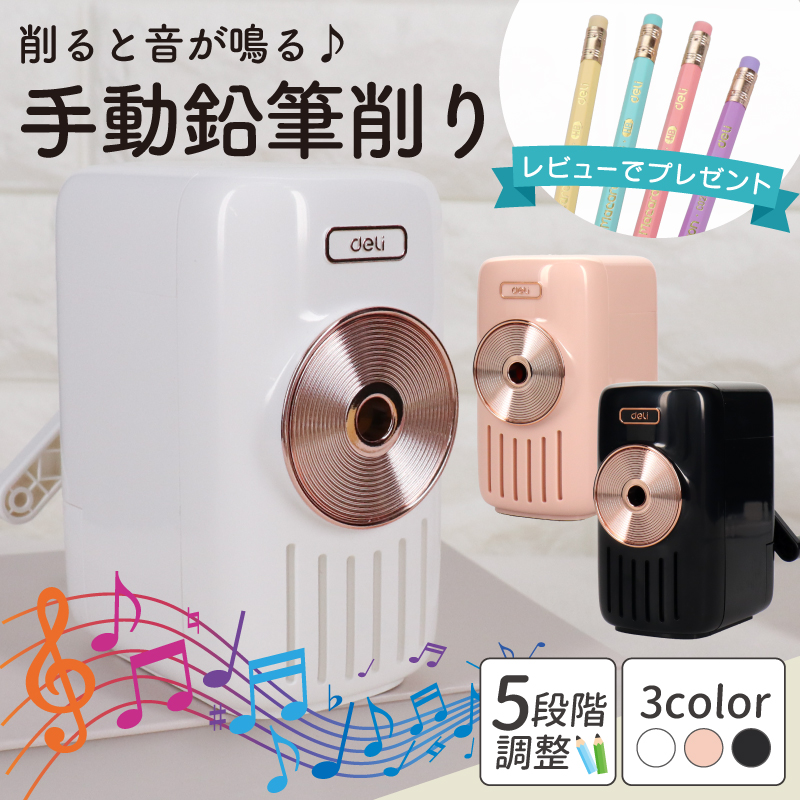 ・ハンドルを回すと音楽が流れ、鉛筆削りが楽しくなります。音楽は背面のボタンで簡単にオンオフの切り替えが可能です。