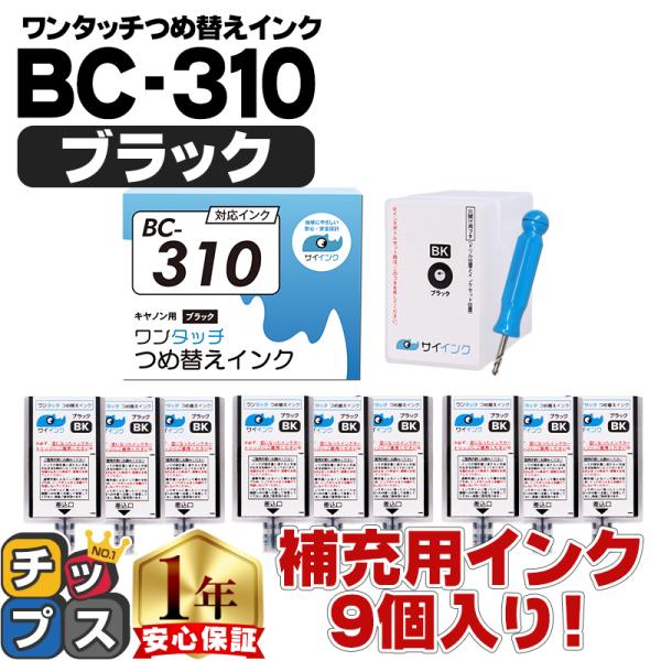 セット内容 | ●BC-310用(ブラック) ・詰替えカートリッジ×9 ・ホルダー×1 ・インク注入用フタ×1 ・穴開け用フタ×1 ・穴開け用ドリル×1 | |