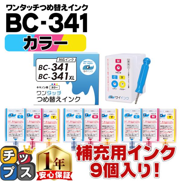 この「BC-341/BC-341XL用詰め替えインク」は、インクを使い切った純正インクカートリッジを再度充填して再利用する詰替えインクです。メーカー純正品ではありません。