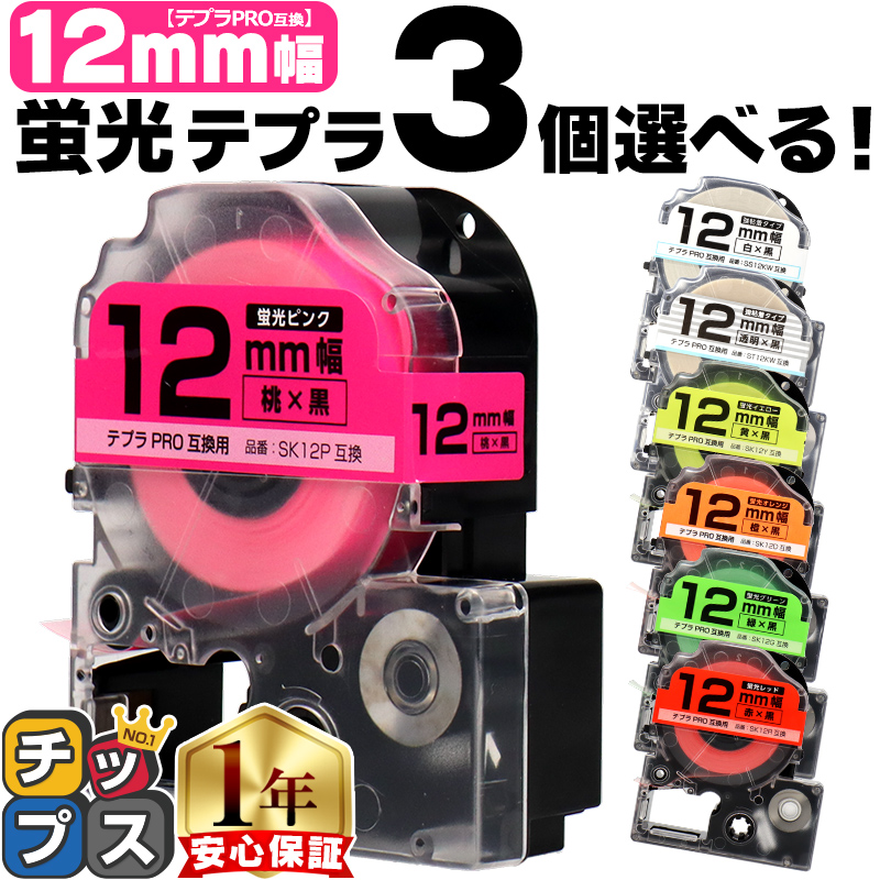 | セット内容 | 下記の中からお好きなテプラPRO用互換を3個お選びいただけます。 ※選択肢がないカラーにつきましては在庫切れです。入荷次第の販売となります。 ● ST12KW(透明地/黒文字) ● SS12KW(白地/黒文字) ● SK12R (蛍光レッド/黒文字) ● SK12P (蛍光ピンク/黒文字) ● SK12D (蛍光オレンジ/黒文字) ● SK12Y (蛍光イエロー/黒文字) ● SK12G (蛍光グリーン/黒文字) | |