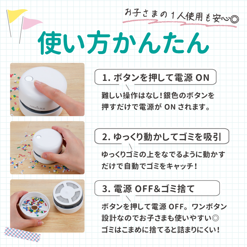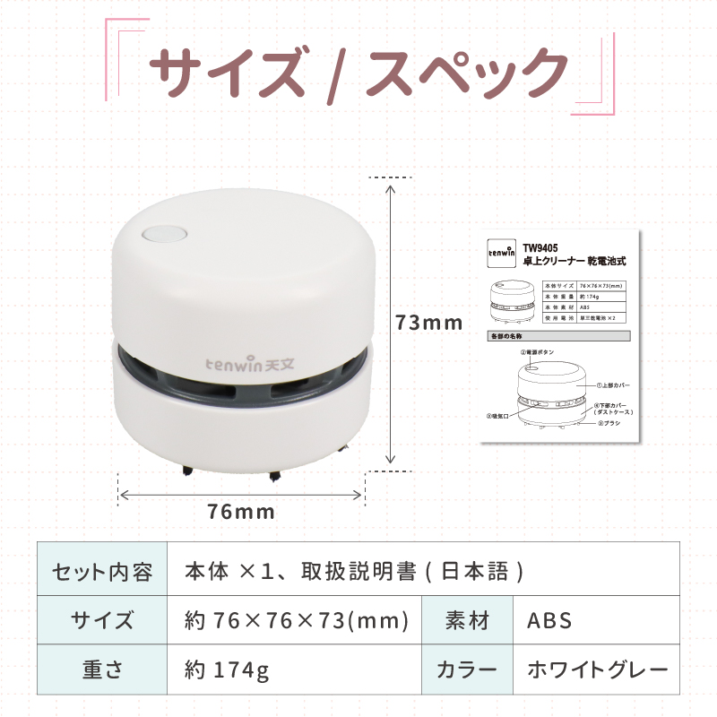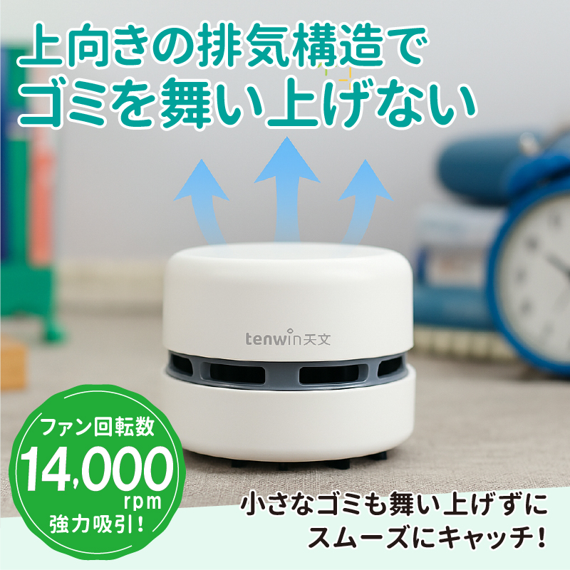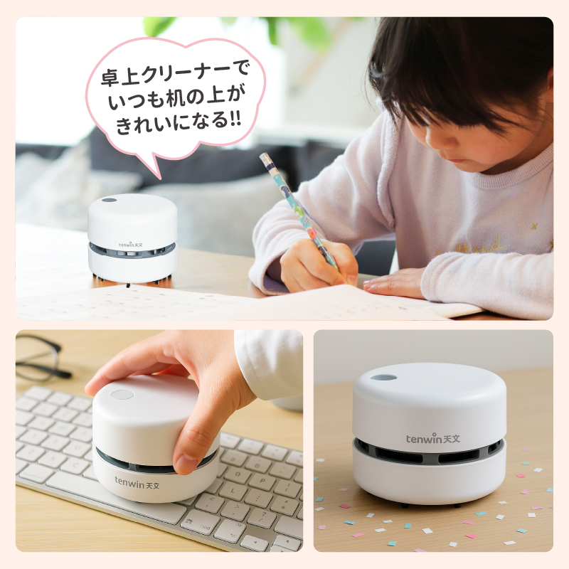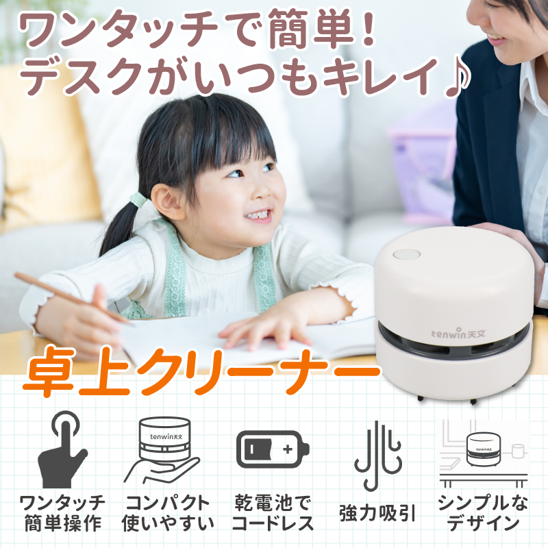 【商品説明】消しカスやホコリなどの細かいゴミを手軽にお掃除できる乾電池式卓上クリーナーです。