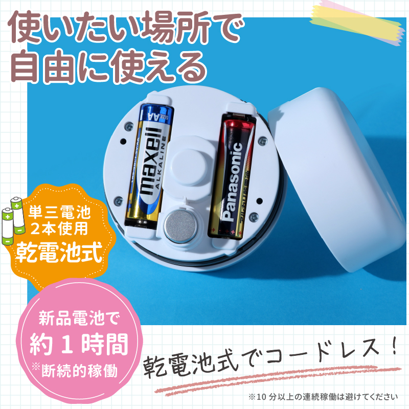 ・新品の乾電池を入れれば、断続的な使用で合計約1時間ご使用いただけます。充電の手間がなく、必要なときにすぐ使える乾電池式です。